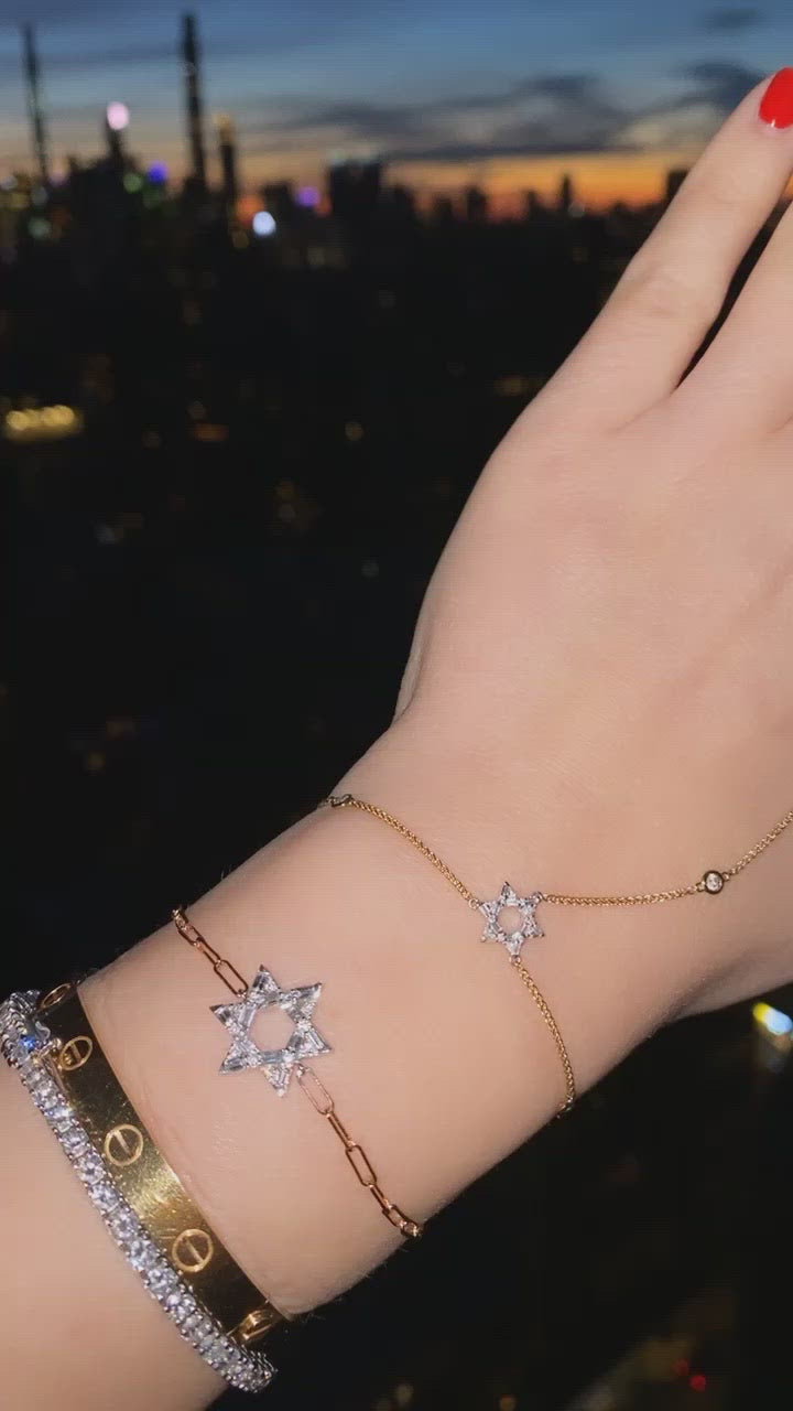 We are obsessed with our newest Mazel piece which took months to perfect! Introducing the Mazel Hand Chain- made out of our mini Mazel in baguette diamonds combined with bezeled round diamonds for a diamonds by the yard look. The clasp is adjustable so you can tighten or loosen it to your liking and it is so comfortable! Once you put this one, you are never going to want to take it off! Finally, the ultimate bracelet & ring duo but with extra Mazel!